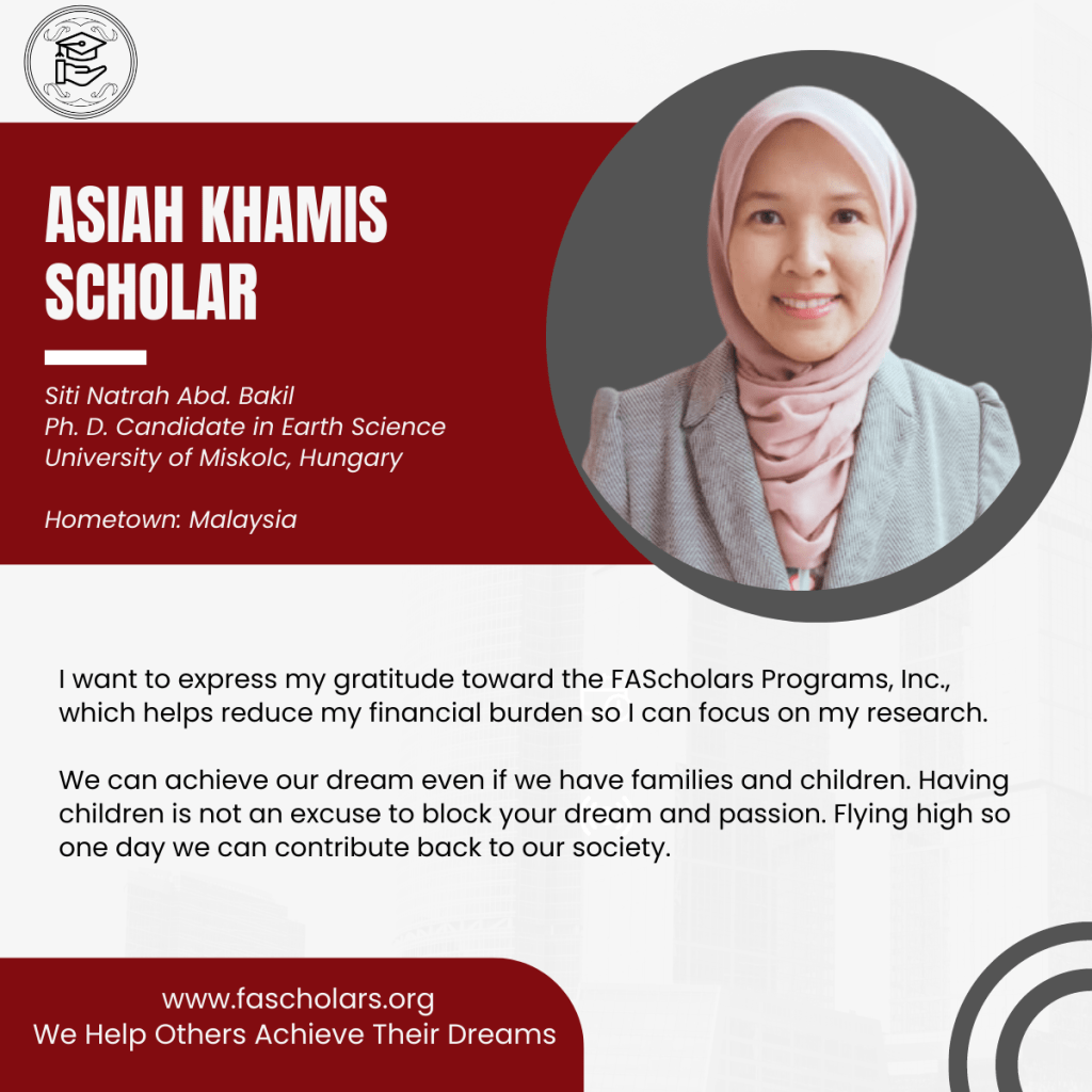 Meet our 2023 Asiah Khamis Scholar: Siti Natrah Abd. Bakil, a Ph.D. candidate in Earth Science from University of Miskolc, Hungary.
