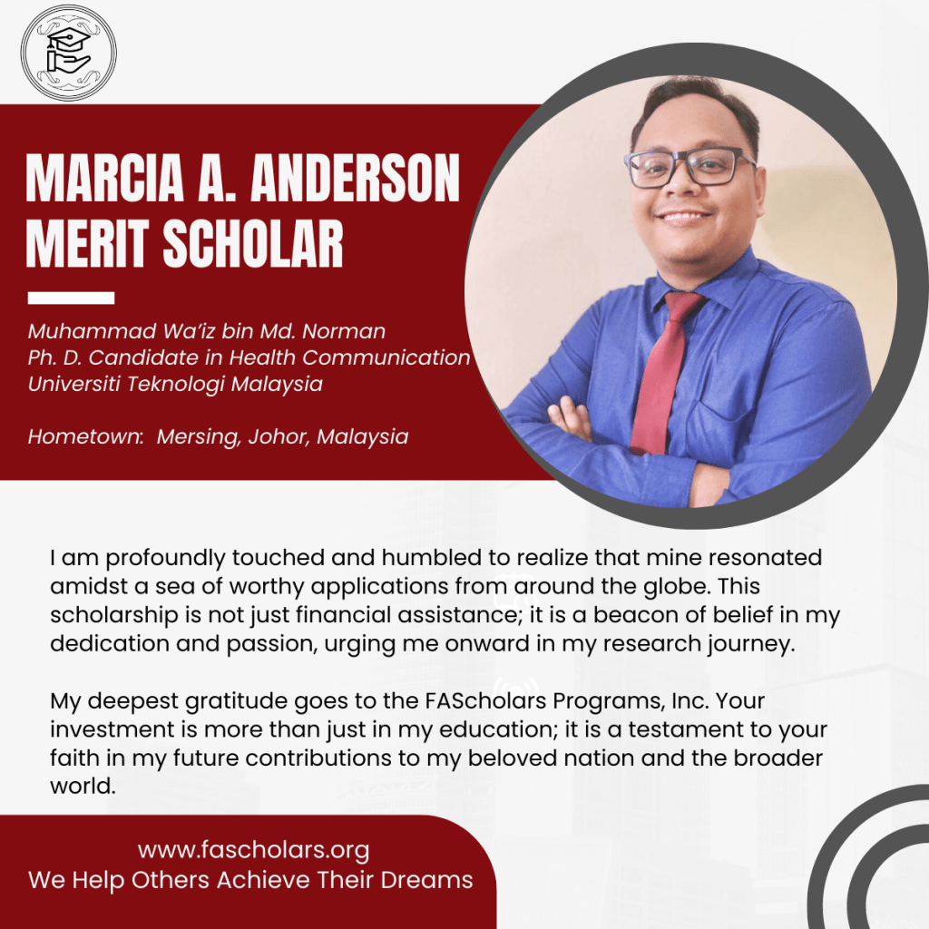 Meet our 2023 Marcia A. Anderson Merit Scholar: Muhammad Wa’iz bin Md. Norman, a Ph.D. candidate in Health Communication from Universiti Teknologi Malaysia.