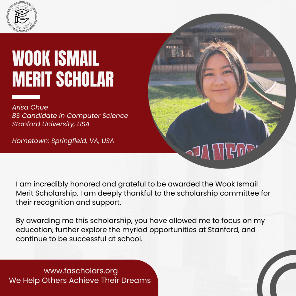 Meet our 2023 Wook Ismail Merit Scholar: Arisa Chue, a BS candidate in Computer Science from Stanford University, USA.