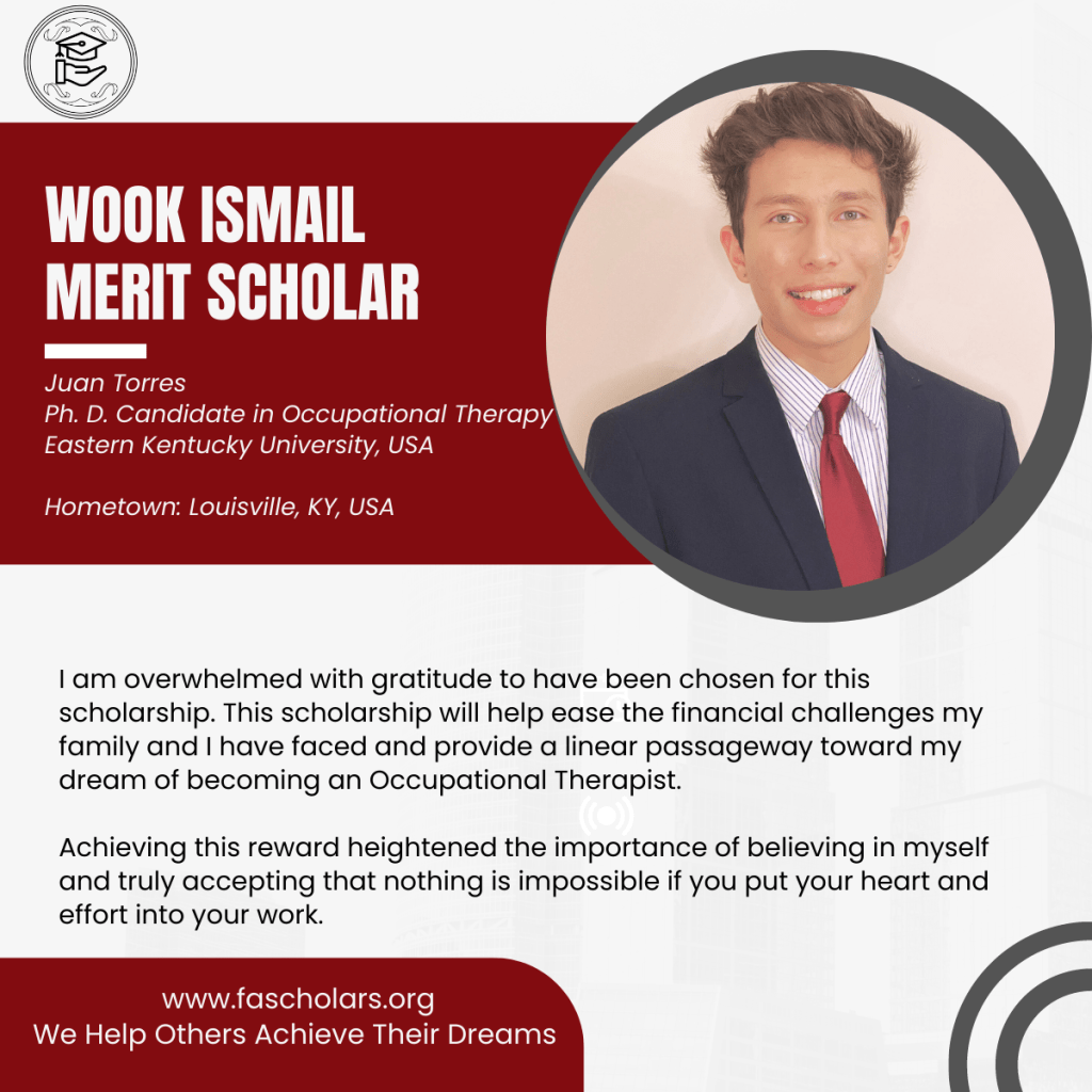 Meet our 2023 Wook Ismail Merit Scholar: Juan Torres, a Ph.D. candidate in Occupational Therapy from Eastern Kentucky University, USA.